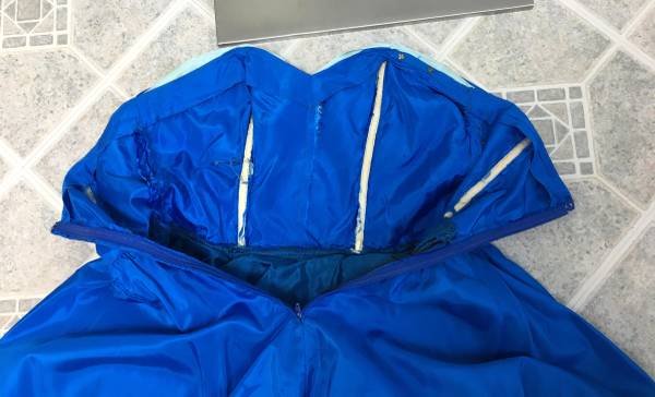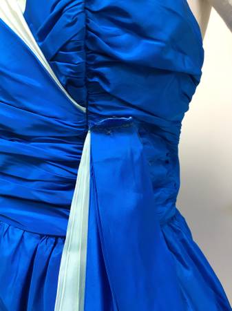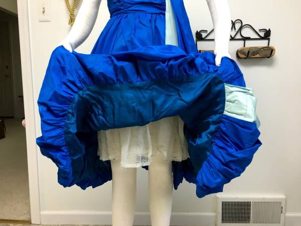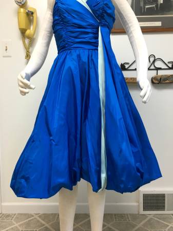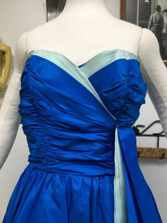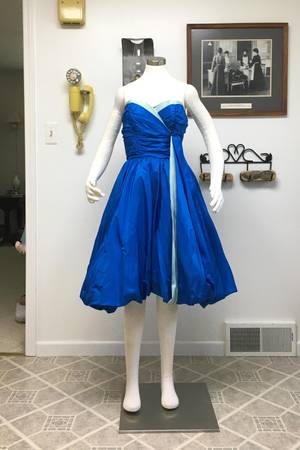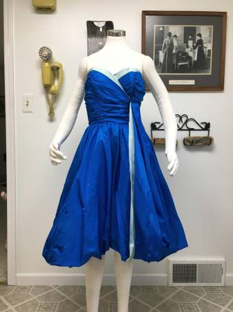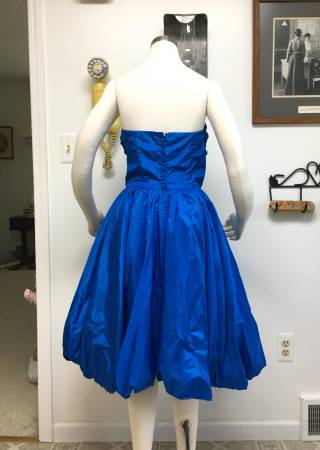 Vintage 1950's Royal Blue Taffeta Strapless "Bubble" Party Dress - What a lovely color and style this dress is. It is made of a royal blue taffeta with a light blue taffeta accent. It has a poofy bubble-style skirt and light buckram type of petticoat underneath. The skirt is full enough that you could still add a small petticoat underneath for extra fullness. On the taffeta ribbon that hangs off the left side, it looks like there must have been something sewn on top of it at one time (a bow maybe?). You could either put a decorative pin over the exposed edges of the strip or take it off and flip that part underneath so it doesn't show. The bust has boning in both the front and sides and it closes with a back zipper. There is no maker or size tag, but I would estimate this as a Small to Medium.