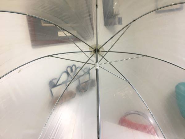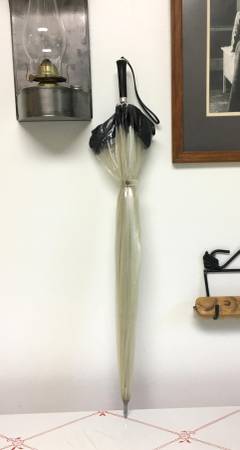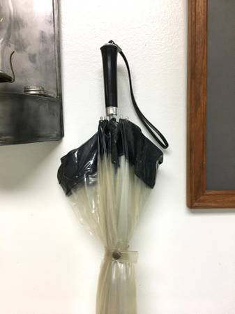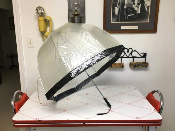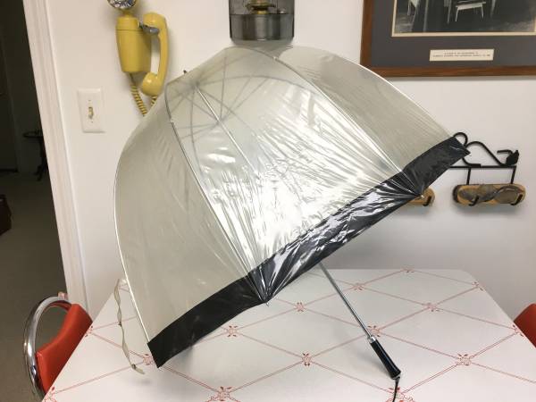Vintage 1960's/1970's Clear Transparent Bubble Umbrella w/Black Trim - This is a true vintage bubble umbrella. Other than the clear plastic being a bit faded (maybe there's a cleaner for that?), it is in excellent condition. The vinyl and frame are in great shape and it opens and closes well. It has a black plastic tip on the handle with an attached wrist strap. $20
