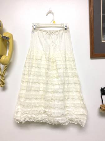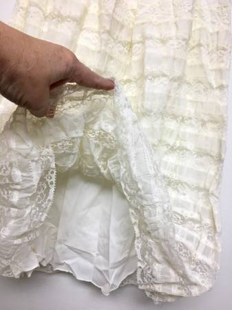 Vintage Aristocraft Dress/Skirt Petticoat/Crinoline - This vintage dress petticoat/crinoline is in excellent condition. It has rows and rows of lovely lace and ruching. It is not a full petticoat to make your dress stand out (Rockabilly style). This is flatter and more like a regular half slip, but the rows of lace give it a nice texture. This is two layers. The nylon layer underneath with a lace overlay. The waist stretches from 20.5" to 32". The length is 24". Made by "Aristocraft" and is a size medium.