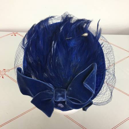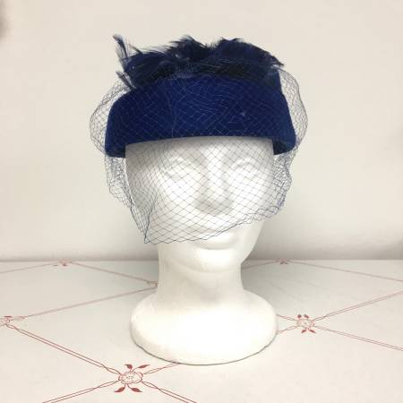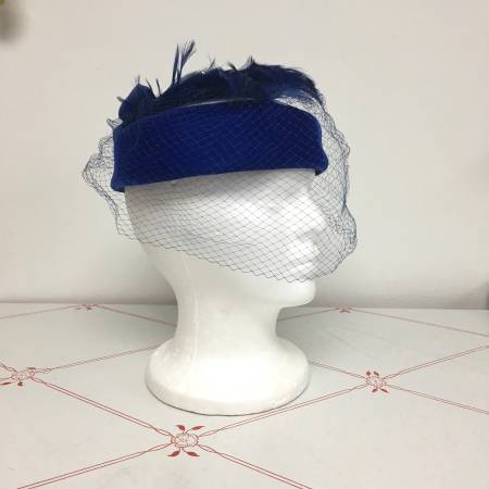 Vintage Blue Velvet, Feather & Tulle Ladies Hat - It is a ring of blue velvet with a crown of blue flowers and a veil of tulle. This beautiful hat is in excellent condition. There are no maker tags inside.