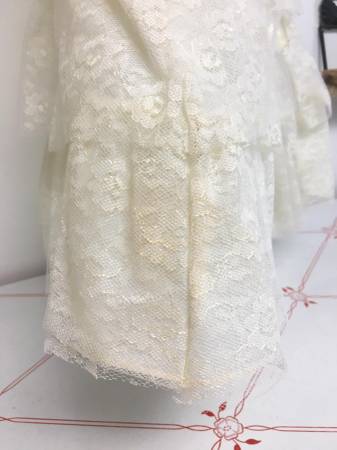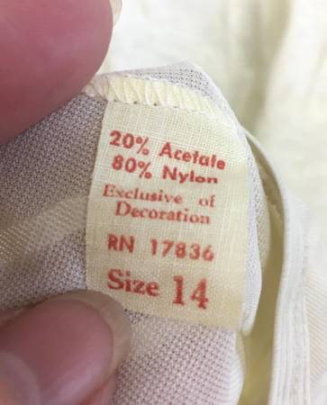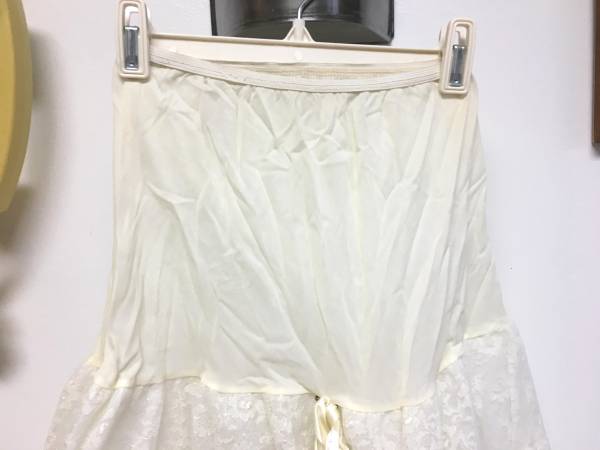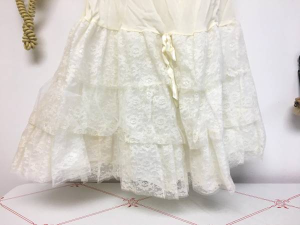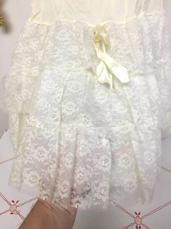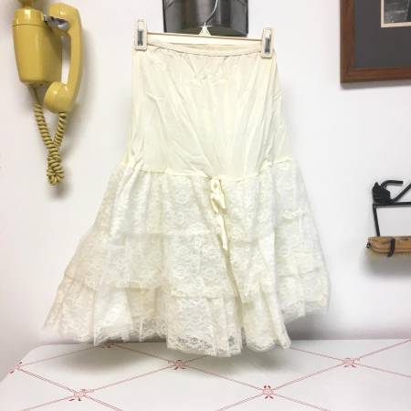 Vintage Dress/Skirt Petticoat/Crinoline With Lace Layers - This vintage dress petticoat/crinoline is in excellent condition. It has three rows of 4.5" wide stiff lace and tulle. The top is stretchy nylon, while the bottom (under the lace) is a stiffer crinoline fabric. The waist stretches from 18.5" to 29". The length is 21". There is no maker label, but the tag does say size 14 (I'm sure that's vintage sizing) due to the waist measurements). I do see one light soil spot on the side of the skirt that may or may not come out.