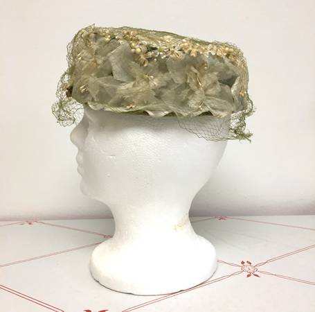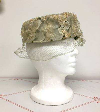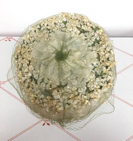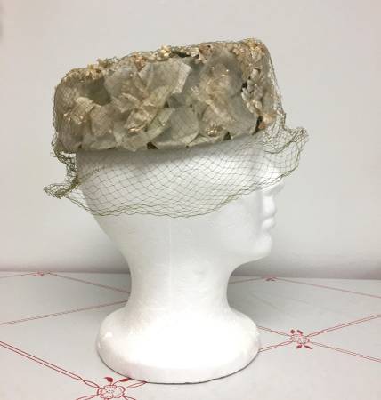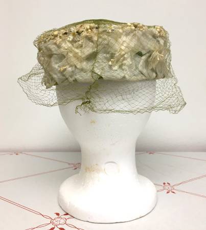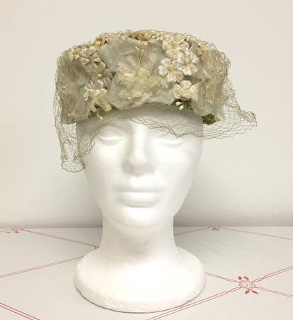Vintage Ivory Flowers & Tulle Pillbox Style Ladies Hat - It is a ring of ivory flowers and a veil of tulle. This beautiful hat is in excellent condition. There are no maker tags inside.