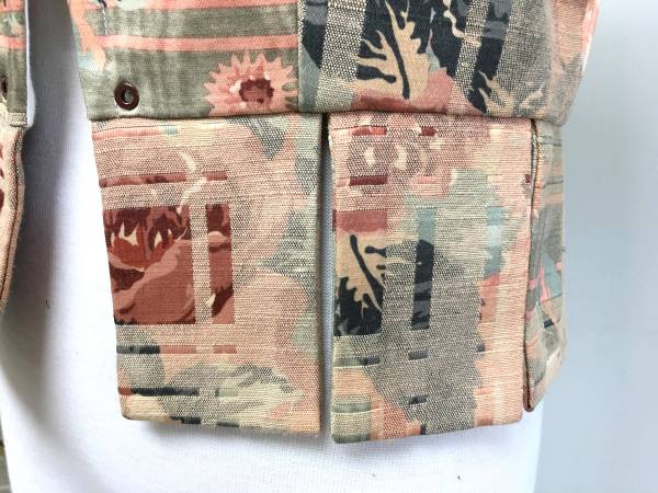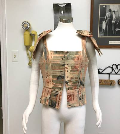 Woman's Flowered Renaissance/Steampunk/Civil War/Halloween Corset - This corset vest laces up the front with 14 eyelets. Those are stabilized in the front by steel boning. It has lappets at the waist so can easily be worn with a large hoop skirt. It has two large bows pinned on the shoulders (so they can be removed) and is fully lined. The smallest measurement is bust 37"/waist 30", but it can be made a couple inches larger by not lacing it tightly closed. The lacing is missing so you will need to add your own string. In excellent condition, but could still use a fresh cleaning to whiten up the lining.