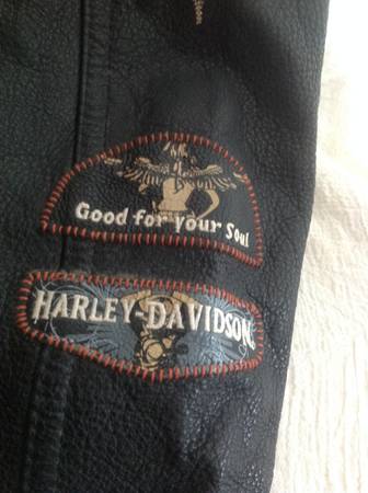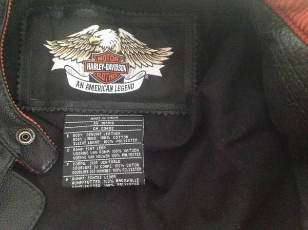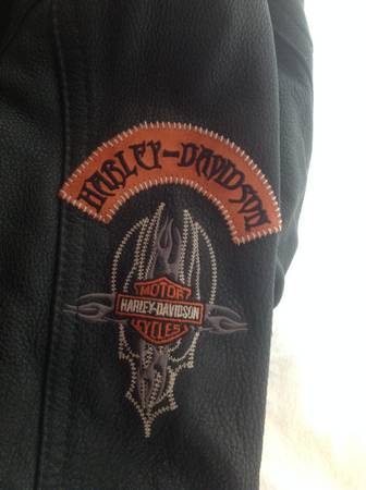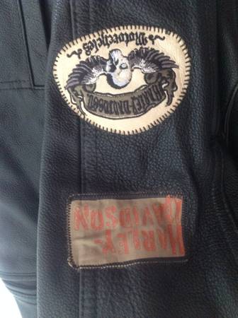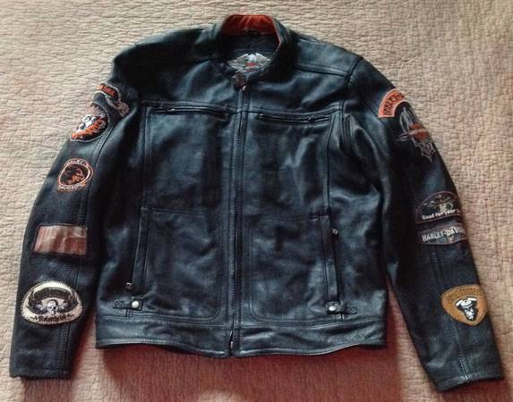 Size Lg. - Heavyweight flexible genuine leather - 9 Harley Davidson patches on sleeves