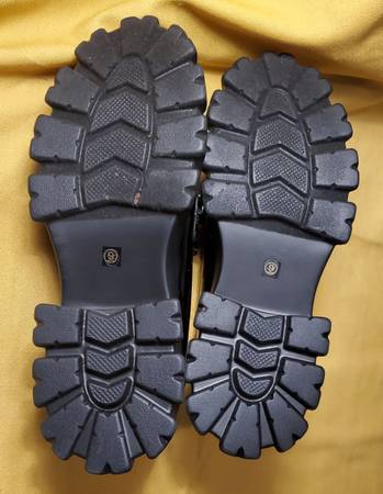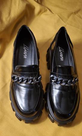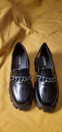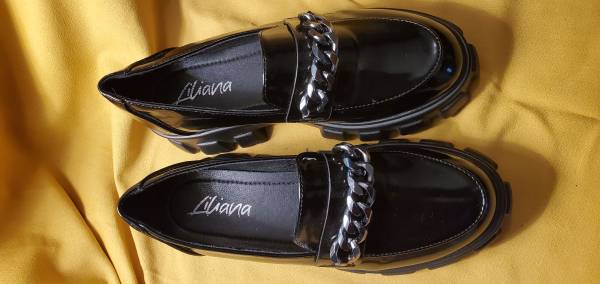 These are Liliana black chunky loafers with a chain detail. The shoes are light in weight and feature a patent finish and a lug sole platform.