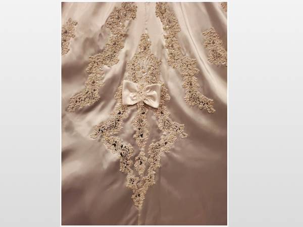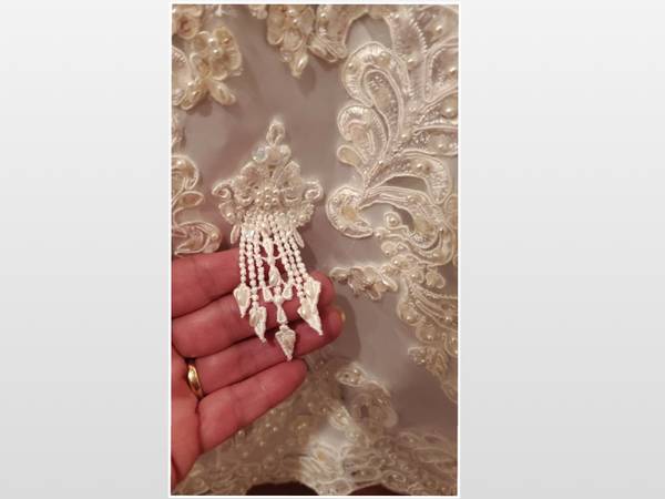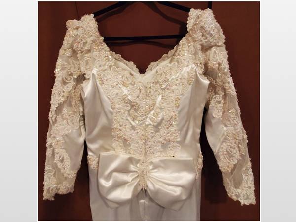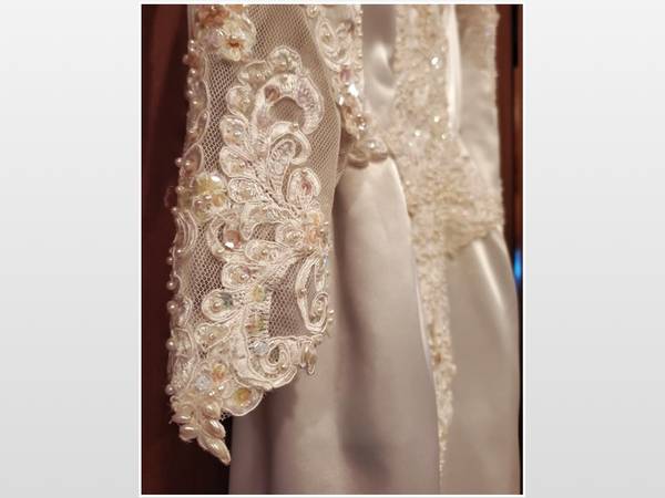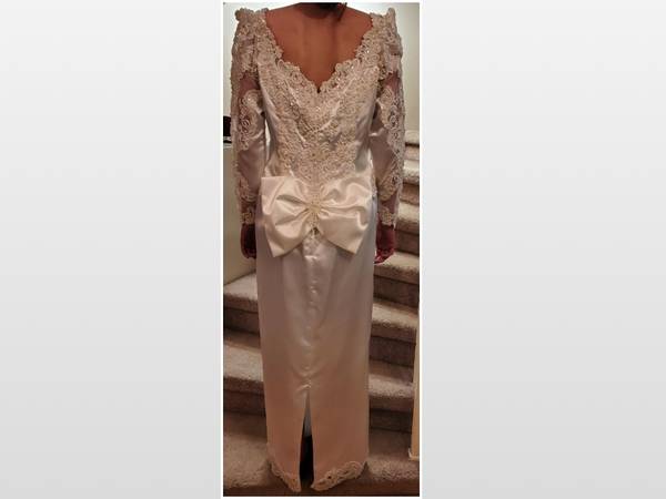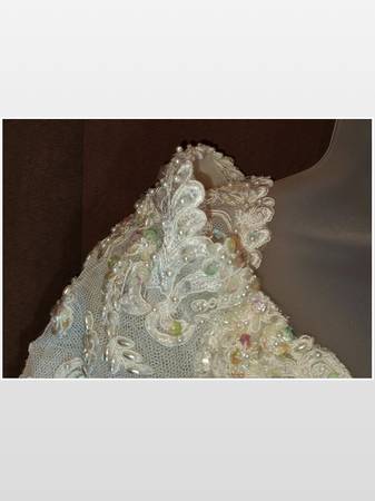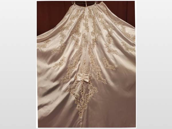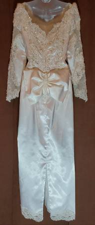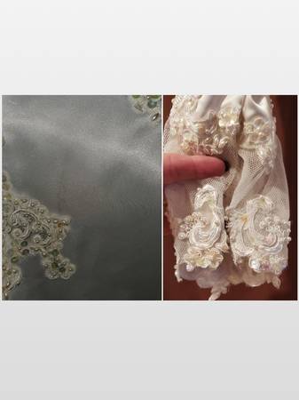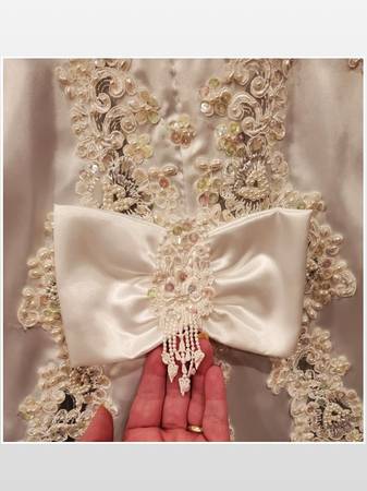 A MUST come try on! From a bride that was happily married for 40+ years. Approx. Dress- arm pit to pit 18”, waist 17.5”, hips 21”, bottom sleeve seem 18”, 58.5”L. Has unnoticeable spots seen in pic, but still vibrantly stunning. Exquisite elegant train- has 7 eyehooks that clip to dress under waist line, bow, sequences, lace, beads & beaded droplets match dress. Approx. train-18”W (top smallest), 97”W (widest), 94”L. Comes w/ extra sequences & wrapped with love in a clear zip plastic garment bag. Ask any questions before purchasing. Please, exact cash, pick-ups in Livonia, no holding, 1st come 1st serve by appt, & poos :) All sales are final & sold as is