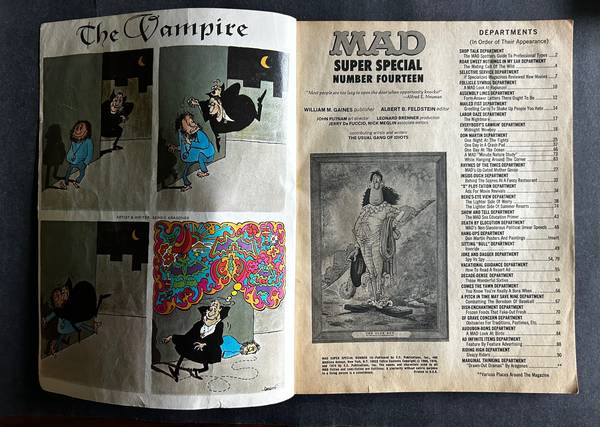 MAD Super Special Number Fourteen from 1974 is 96 pages long and has 16 pages of new material. The Don Martin insert, however, is missing. It also have a few later pages with slightly dog-eared bottom corners. Again, no artwork or text is affected.