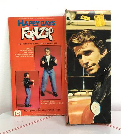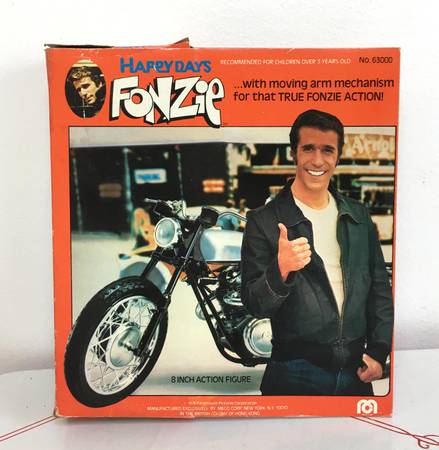 Vintage 1976 MEGO "Happy Days" Action Figures - Complete set of fully poseable figures includes The Fonz, Richie, Potsie & Ralph. The Fonz is the only one that is not new in his box. The box is a little worn, but the figure is in excellent condition. All his limbs seem to work perfectly, including his thumbs and lever to raise his arms. The only flaw I see is one small spot on the back of his pants. All other figures are new in their packages. Made by MEGO for Paramount Pictures. Model #63000, #63001/1, #63001/2, #63001/3. They are 8" tall. This is a rare set, especially in this condition. $190 for all four figures.