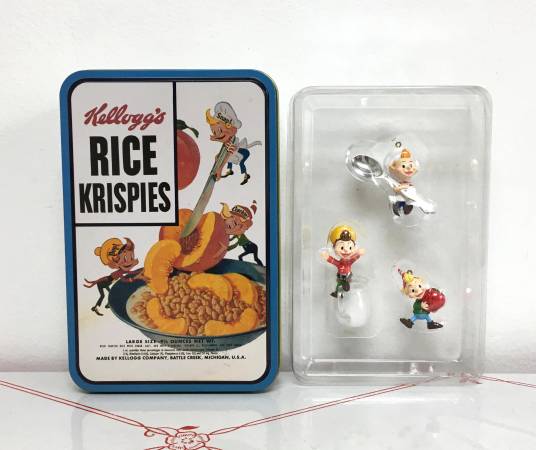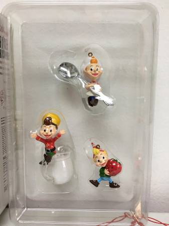 2002 Kellogg's Rice Krispies Snap, Crackle & Pop Mini Holiday Ornaments - A very cute set of Snap, Crackle & Pop ornaments in their own special Rice Krispies tin. The smallest ornament is 1.5" and the tallest is 2.75" tall. These are still brand new in their tin. $10
