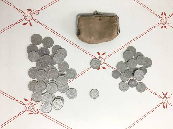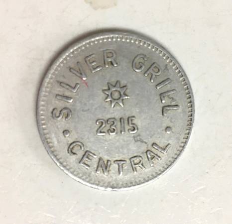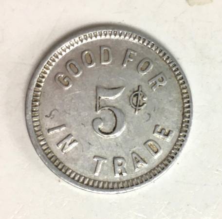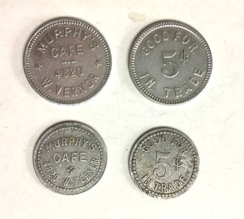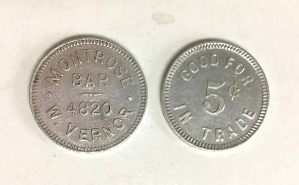 Collection of 54 Vintage 5c Liquor Tokens and One Franc Coin - What a nostalgic collection this is. There are 54 coins for 5 cents off of a drink. I believe these might be from the 1940's so that 5 cents would have gone farther then. They are from three different Detroit bars, although the two look to be the same place where just the name changed. Also includes one French Franc coin and the old clasp purse they all came in. $30 for the lot. The bars on the tokens are: