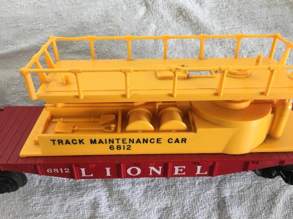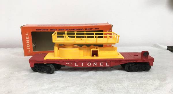 Lionel O-Gauge #6812 Track Maintenance Car. The handle that turns the crank to raise/lower the platform is present and works fine (although care must be taken as it is fragile). Base number is 6511-2. Needs cleaning, but it is only surface dirt so should clean off easily. It looks like all handrails are present and in tact. This is one of the rarer dark yellow versions from 1959 and includes it's original box. Missing the two workmen figures. $30