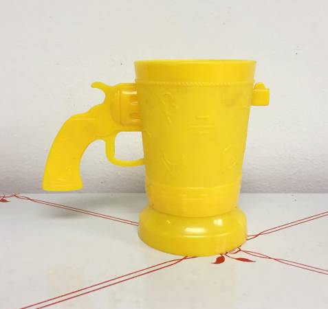 Vintage 1950's Child's Yellow Plastic Western/Cowboy Cup w/Pistol Handle - The perfect cup for any Western or cowpoke loving child (or adult). Made of yellow plastic, it stands approximately 4.5" tall and is 2.75" in diameter. Made by EZ-Por Corp. I see no chips or cracks, but it could use a better cleaning. $10