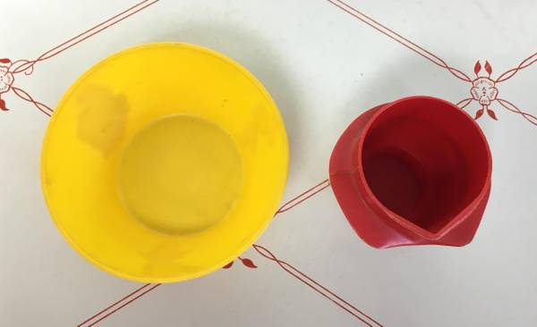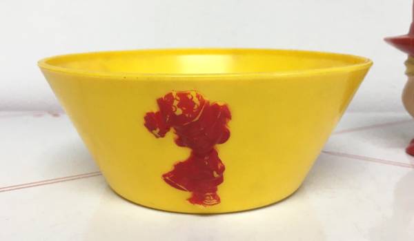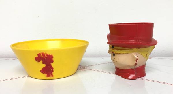 Vintage 1950's "Dennis the Menace" Child's Plastic Cup and Bowl - The bowl has three different images of Dennis playing. The cup is in the shape of Dennis' head and he wears a hat. Good condition for their age, but there is some paint loss. $15 for the set.