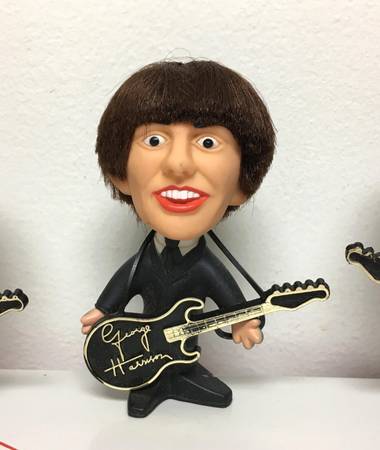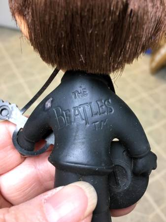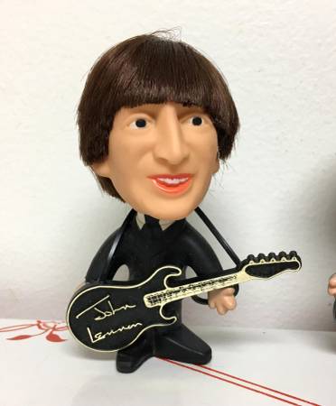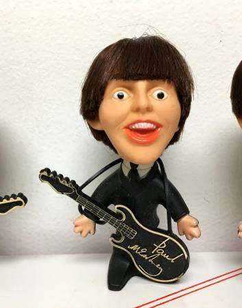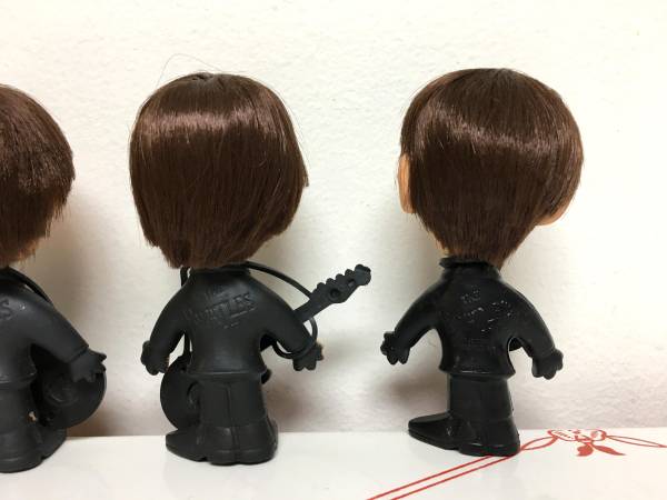 Vintage 1964 Nems "Beatles Fab Four" Figures - John, Paul, George, Ringo - What a fabulous find! The complete set of four Beatles figures from 1964. John, Paul and George each have their guitars and Ringo has his drum. In absolutely awesome condition! Even their hair is not messed up. The only flaw to note is a rub on one of their shoes. It's possible this happened in production. Each figure is approximately 4.5" tall. Made by "Nems" of soft rubber with rooted hair.
