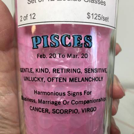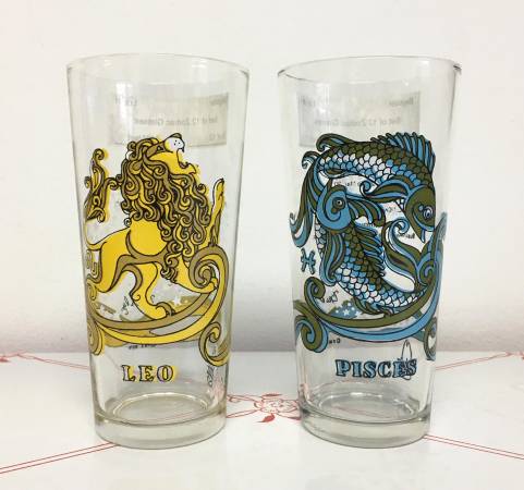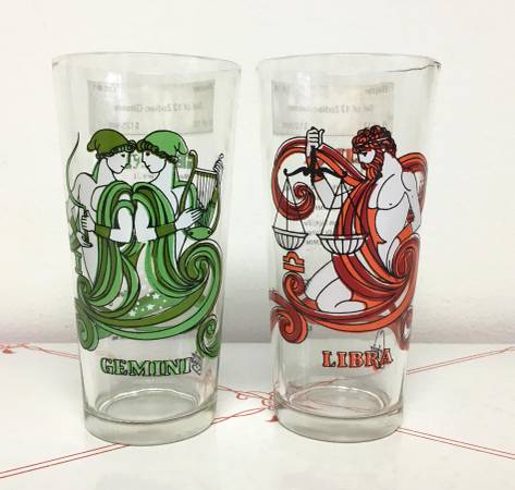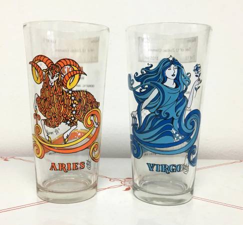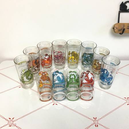 Vintage 1965 Complete Set of 12 Arby's "Astrology - Zodiac" Drinking Glasses - It's rare to find all 12 of these glasses in a complete set. All 12 are in excellent condition with no chips or cracks. Distributed by Arby's, they look like they have never even been used. Each one is approximately 6.25" tall. $125 for the complete set (will not separate)