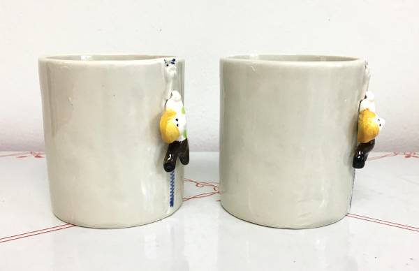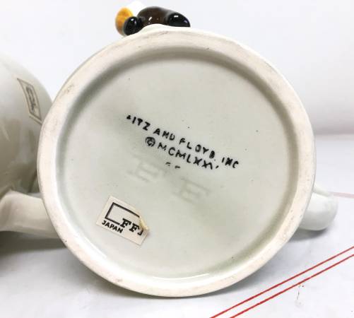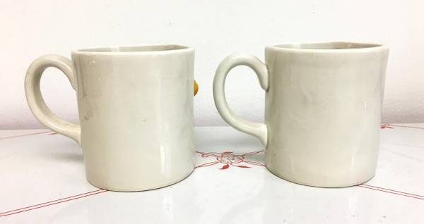 Vintage 1970's Hand Painted Fitz & Floyd "Zipped Up" Coffee/Tea Mugs - This pair of Fitz & Floyd ceramic mugs features a man holding on to a zipper on the side of the mug. They are both in excellent condition and look like they've never been used. Approximately 3.5" tall and 3.25" diameter. $8 for the pair