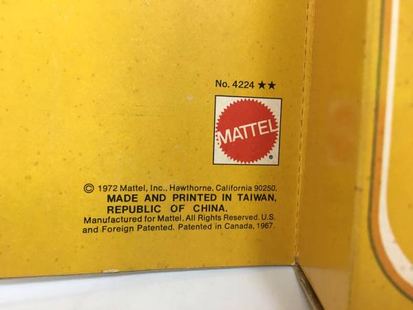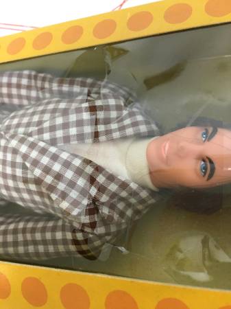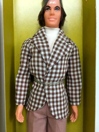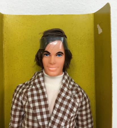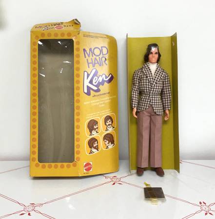 Vintage 1972 Mattel "Mod Hair Ken" Barbie Doll - This Ken doll has combable hair and includes a sheet of stickers that include a beard, sideburns and two moustaches. He is like new in his box, still attached to his packaging. The only flaws I can see are his box. It is in good condition, but not pristine. The top flap is open and bent up a bit and there is a rip in the front celophane. Model #4224. Made by Mattel. $150