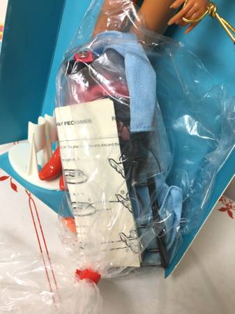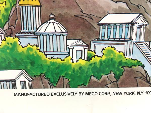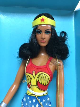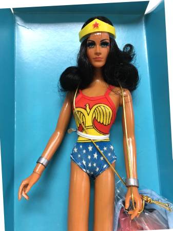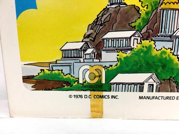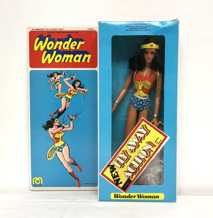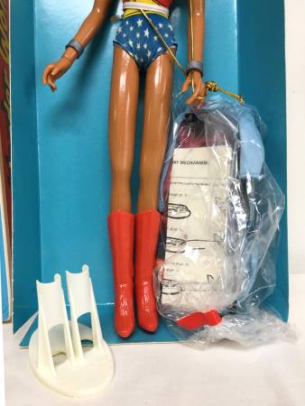 Vintage 1976 Mego Poseable "Wonder Woman" Action Figure with "Fly Away Action" - This is a rare Wonder Woman set to find. This set includes a coral evening gown, blue coat, shoes and stand. Also includes the "Fly Away Action" harness. I see the elastic band for the harness is stiff. It looks to just be a hairband. I will include a new one that looks like it will work, but can't be 100% sure. The extras were all packaged in a clear bag stapled to the packaging. That bag was sealed, but I had to open it to see everything included. The doll is in excellent condition and seems to have the bendable arms and legs. I was afraid to try to bend them and break something. Her wrists also turn. Looks like everything is included that should be. She has her headband, golden lasso, wrist bands, boots and costume. She even still has the plastic wrap around her forehead. The box is even if unbelievably good condition considering its age. Made by Mego Corp, Model #73500/1. She is just under 13" tall.