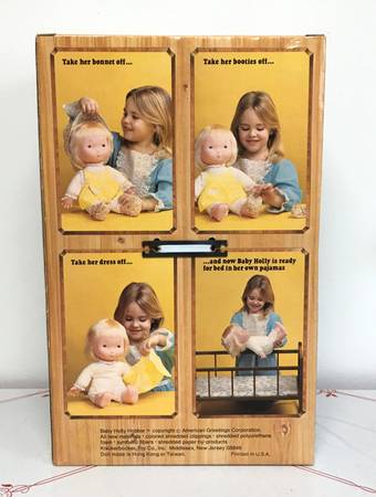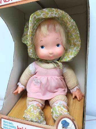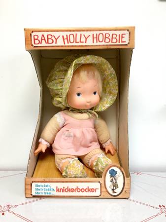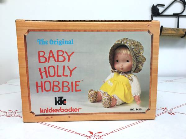 Vintage 1977 Knickerbocker "Baby Holly Hobbie" Doll - This cute, soft, cuddly babby doll is brand new in her box. Vinyl head, hands and legs below the knee. Wearing a pink dress. Approximately 14" tall. Model #3415. Made by Knickerbocker. $40
