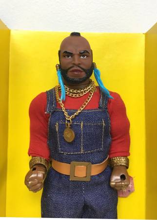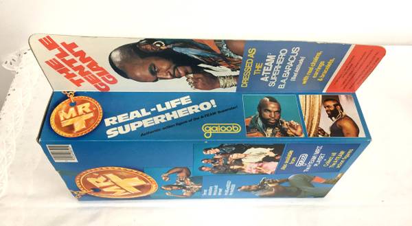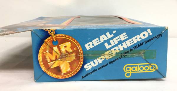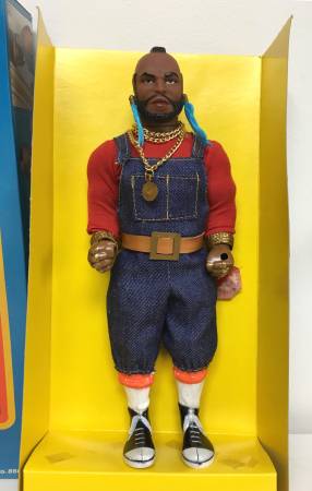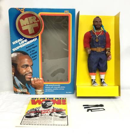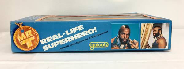 Vintage 1983 "Mr. T" - A-Team's B.A. Baracus Action Figure - This Mr. T figure is fully jointed and poseable, has removable clothes, real chains, medallion, earrings and bracelets. He comes with a hand saw and bolt cutters that you can have him hold. Although the box has been opened, he is still attached to his cardboard backing. Both the figure and his box are in excellent condition. He stands approximately 12" tall and is made by Galoob. Model #8501.