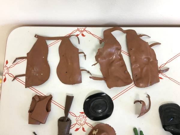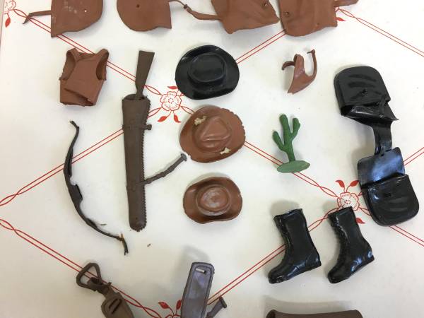 Vintage Johnny West Costume Accessories - Includes hats, chaps, saddle, saddle blanket, saddle bags, boots, bow, vest, bandana and rifle with scabbard. None of these are marked, but in researching, they look just like the items that come with the Johnny West dolls. These aren't in great shape, but not bad for their age. One hat is kind of chewed up around the edges and the saddle bags are a tad gummy and all items could use a cleaning. $10 for the whole lot