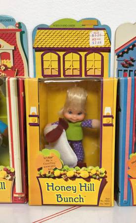 Vintage Mattel 1975 "Honey Hill Bunch - Li'l Kid in Green" Doll - I have nine different Honey Hill Bunch dolls available. This listing is for "Li'l Kid" in green outfit. It is approximately 5" tall. Please note that the photos of the back of the box do not necessarily belong to this doll. I'm using the same "back" photo for all nine listings.