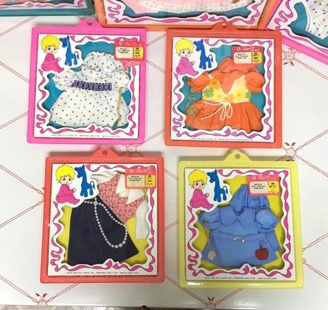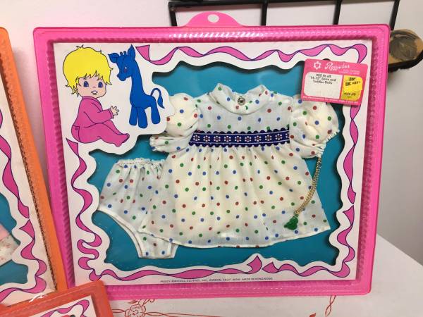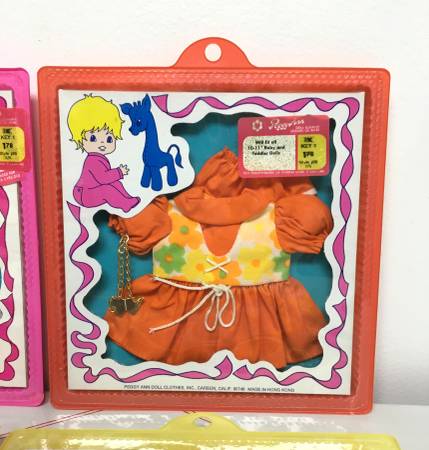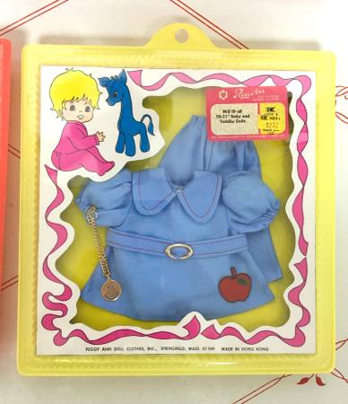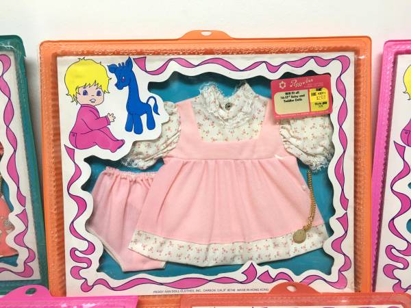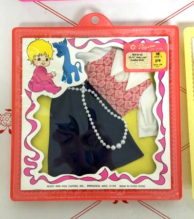 Vintage "Peggy Ann" Baby Doll Clothes - These doll clothes are from the 60's-70's and are brand new in their packages. An absolutely awesome find for the doll enthusiast or collector. All are sealed except the center large package (pink dress in orange packaging). The plastic has fallen off that one, but is there and could be reglued if you desire. The doll sizes they fit are on the front of each package and range from 10"-19" dolls. Each outfit comes with a top, panties and an accessory necklace/bracelet.