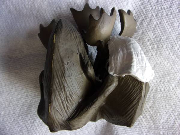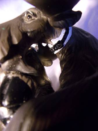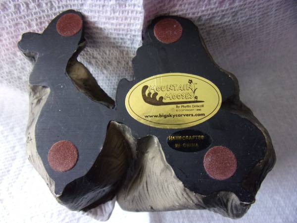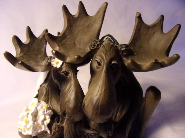 Resin Moose Bride & Groom figures, Mountain Moose by Phyllis Driscoll. 4 1/4"T X 4"D X 5"W. Slight paint loss on the back of the groom as shown in picture 5. $10.00 Cash only Will meet at Burger...