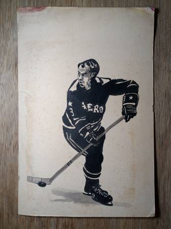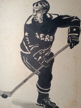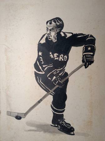 Gordie Howe ink drawing on board. Most likely from the 70's as jersey is Aeros where he played then and his number 9 was retired. About 15" high x 11" wide. 5.oo 3one3 - 57three - 319two