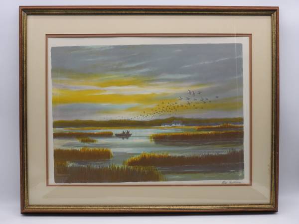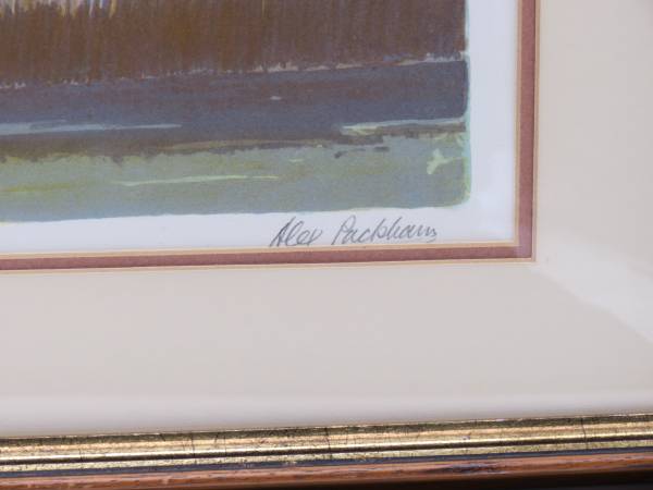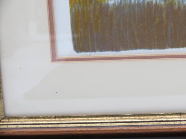 This lithograph is in pristine condition. The matting has a small stain on the lower right side close to the frame. The vintage frame is scuffed but in very good condition. This is number 175 of a limited edition of 275 and pencil signed by the artist.