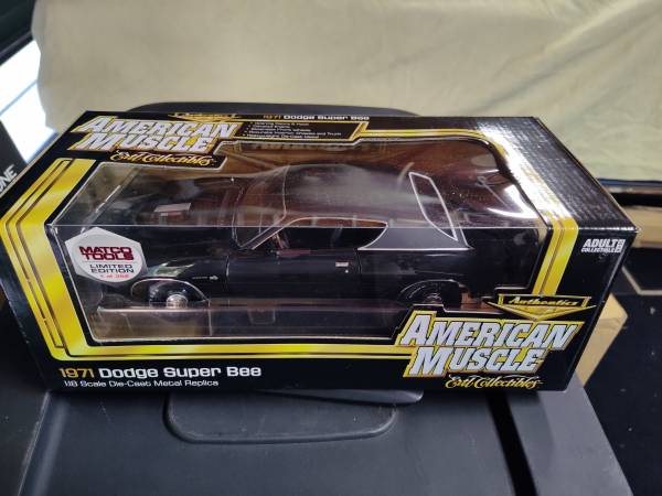 American Muscle 1971 Dodge Super Bee Black on Black. 1/18 scale Diecast Car. Like new condition not sure if it was ever removed from box. If interested call or text 734-30six-eight -eight-one-one