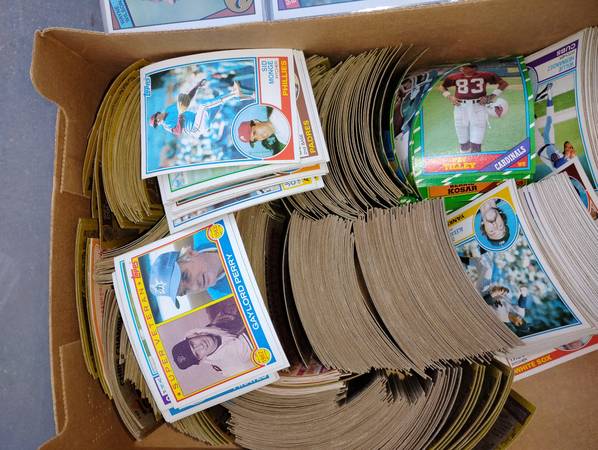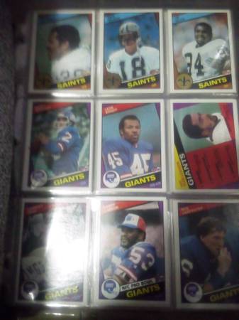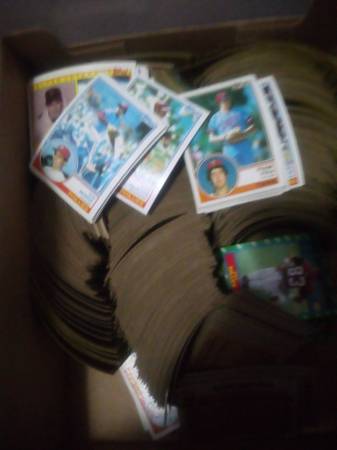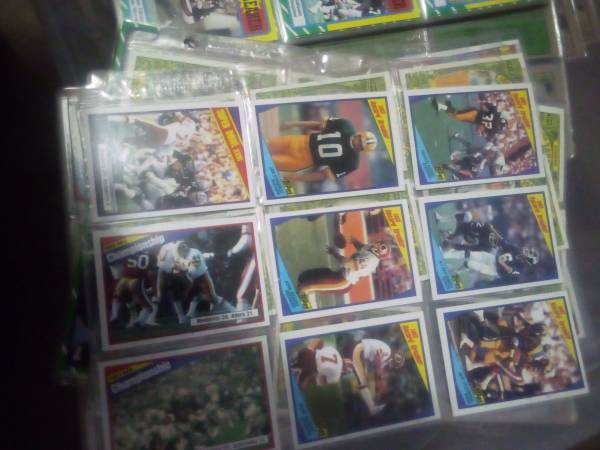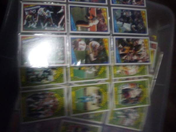 football cards in 90 + plastic sheets 9 to a sheet in boxes, + another 2 boxes, 1600 hand fulls of some baseball cards and football cards. For faster pics this weekend text 5 eight 6 six two 3, 0, 2...