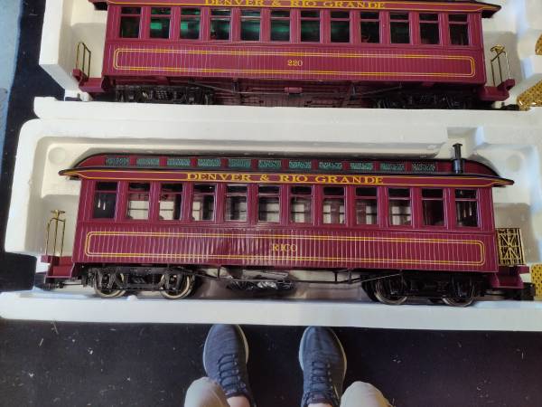 Very nice set of three Passenger cars G scale. Made by Bachmann, metal wheels, lights in cabins, well made cars. nicely detailed. Plus, the boxes for them.