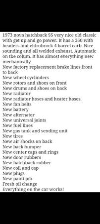 73 nova hatchback with a salvage title reflects the price. Car runs and drives good lots of new parts ready to cruze.