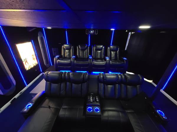 - From 4seating. Chaise Lounge on each end. Power Recline, Black Leather, Row of 4 Sofa with Drop-Down Table, Storage Console, Blue LED Cup Holders. $1,200.