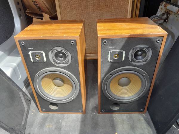 These were a pair of empty Pioneer HPM 40 cabinets that I received many years ago and reloaded them to create a good sounding set of workshop speakers. They have their share of nicks and scratches, but still sound as good as the day I made them. Please see the pictures. Sold as-is.