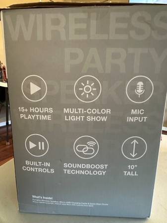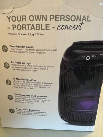Quikcell Wireless Party Speaker Your own personal – portable – concert $20 plus shipping Multi-color light show. Mic input Built-in controls Soundboost technology. Booming with sound – brings you...
