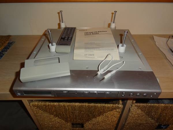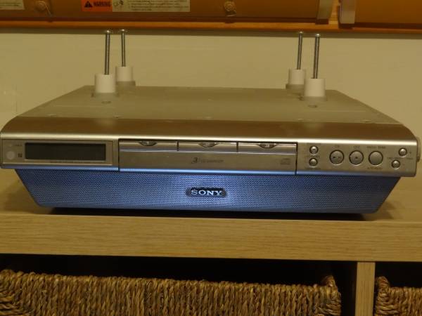 Sony clock radio/CD player, under the counter mount, with remote, mounting hardware, and instruction manual, 12.5" deep x 14.25" wide, x 4" high