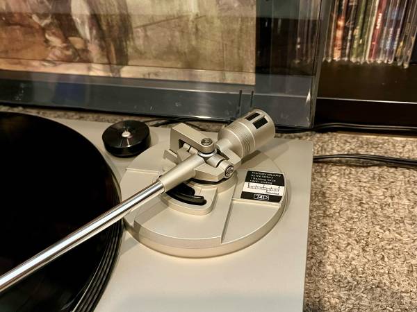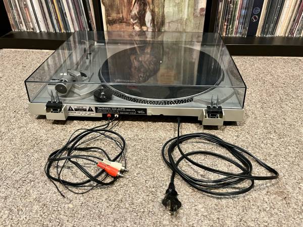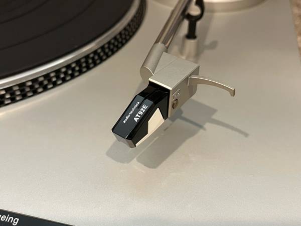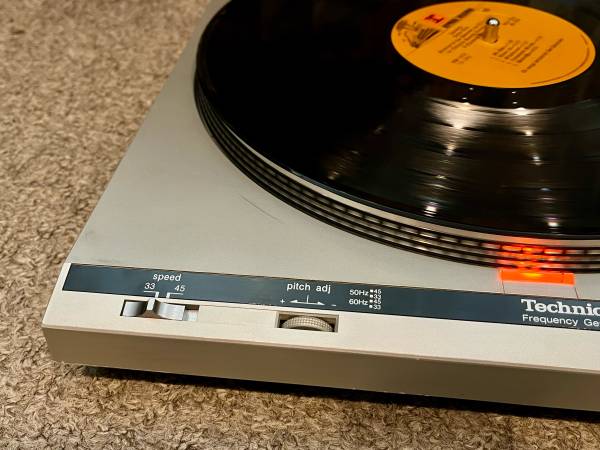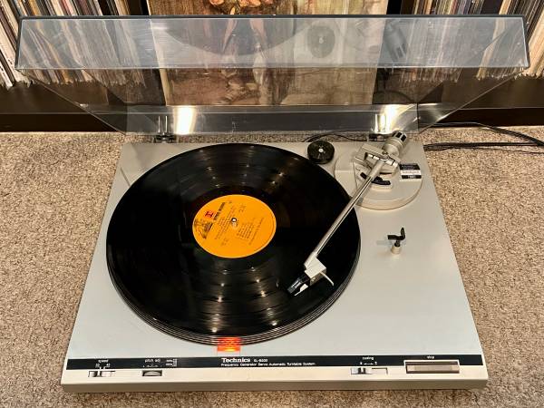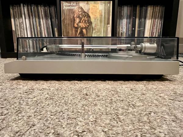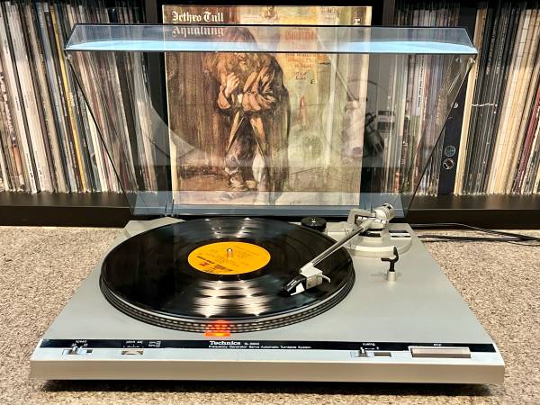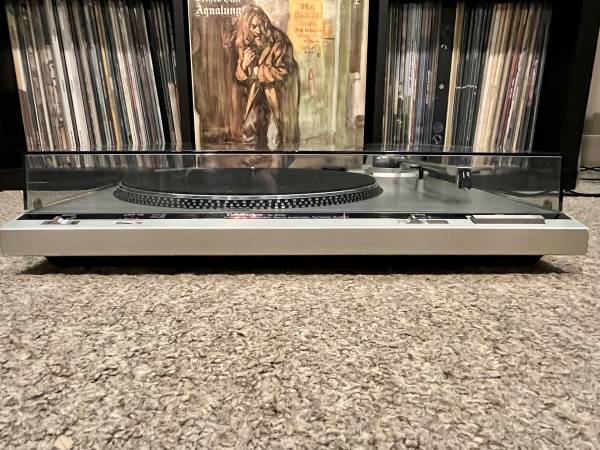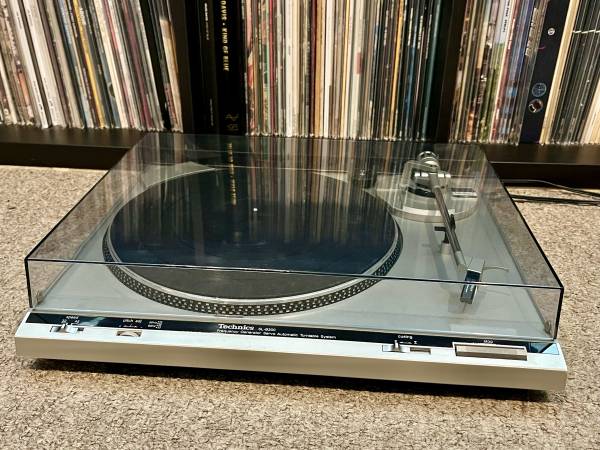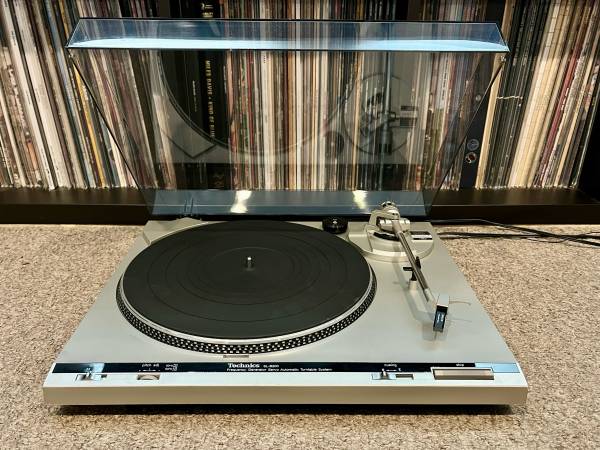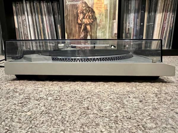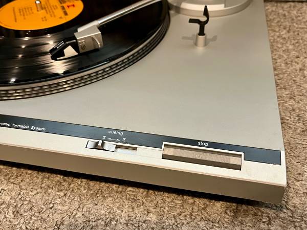 Vintage Technics SL-B200 semi automatic turntable. Belt drive with automatic tonearm return operation. Made in Japan during the early 1980’s. This turntable is in beautiful original condition. The original dust cover is in very nice shape and still nice and clear with just a few light marks here and there. Everything works perfectly with this turntable. Very nice sounding Audio Technica AT92e cartridge with original low hour elliptical stylus. The stylus has been used but still has lots of life left in it. This table holds proper speed at both 33 and 45 rpm. The tonearm cueing works perfectly. Tonearm has a nice smooth descent to the records surface. Includes the 45 rpm adaptor.