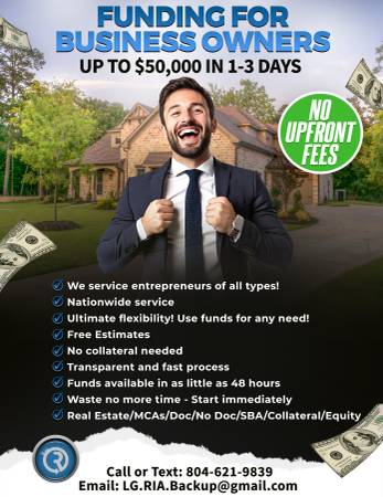 Real Estate Investors, Business Owners, Stay at home parents, Unemployed, Start-up Businesses, and Entrepreneurs: we have funds you need.