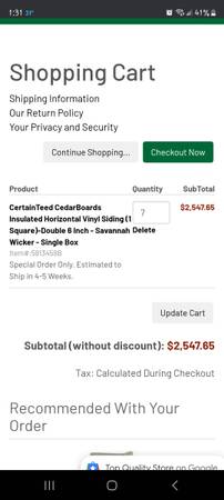 Certainteed VINYL SIDING DOUBLE 6 INSULATED CLAPBOARD IN SAVANNA WICKER COLOR. 7 SQUARES AVAILABLE. WOULD LIKE TO SELL AS A LOT, WILL CONSIDER SEPARATING. $1800.00 or best offer Pickup in Allen Park