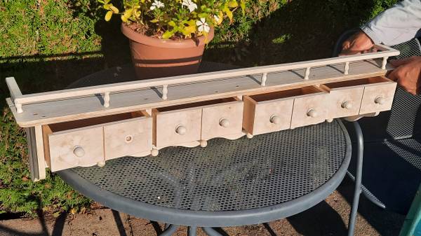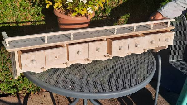 Decorative antique shelf with drawers, hooks & top shelf rail. Just needs a light cleaning and paint job to make an attractive, hard to find, eye catching piece. Measures 36" long x 9" high. $25