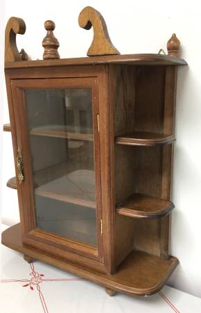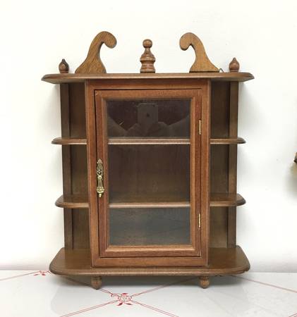 Vintage Glass Tabletop/Hanging Curio Display Cabinet with Finials - It has three shelves to display your small collectibles. The center part is covered by a glass door. The two sides are open and not behind glass. Topped with decorative finials. Made of wood. In very good condition for its age. This is made to hang on a wall, but is still able to sit flat on a table. Approximate measurements are 16.5"x14"x4.5".
