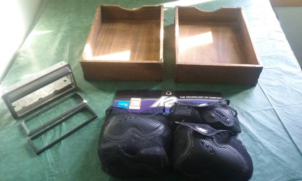 2 wood drawer boxes, skate hockey knee elbow pads, radio install...