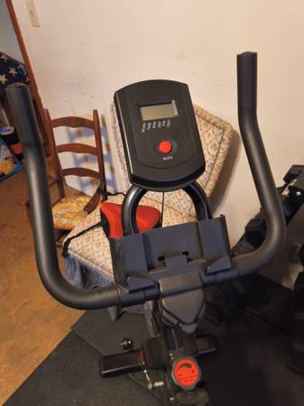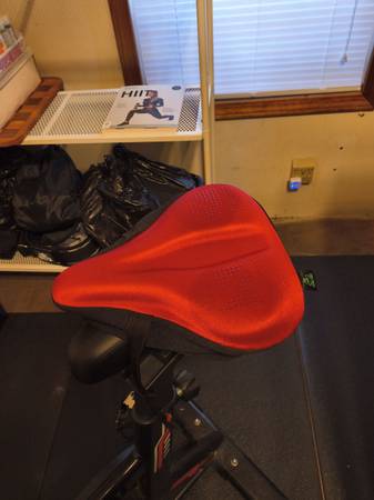 Like new stationary exercising bike only use twice works very well husband had surgery cannot use anymore super excellent condition. Comes with brand new red seat cover.