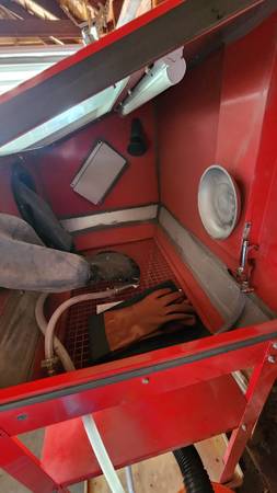 Added better light inside, added heat lamp for making sure minimal humidity, has a water filter on the air hose for the media as well, replaced gloves with better ones (still comes with old as well, also reversed the way the glove go in so that no possible dust can come out, siliconed it sealed, filled any divets like in the door or places where the media could settle, added an electrical box onto the blaster itself and a ground, replaced the glass with good glass that you can actually see through and doesnt scratch either, has extra replacments of thaf same glass, added rivets and screws on the frame for easy changing out of the glass, drilled to hole for another tube that blows just pure air and not media perfect for blowing everything down before opening the door to minimize media falling out when taking the product out, added a new funel that actually helps all the media move fluidily and doesnt get stuck anywhere also has an adjustable lever for desired air flow, has a little magnetic bowl in it for small metal pieces to not get lost, angled a piece of duct where none of the media can fly out of the vent when wanted adjusting the pressure, back was modded with a pipe with another spot to adjust pressure but mainly for a universal wet vac tube size to stick into, which goes to a bucket with a seperator on top to reuse media longer, made a wood tray with rollers for easy moving as well as it now raises it to the perfect height to not be all bent over the whole time while working because the arm holes were in the dumbest spot meant for dwarves or something, it also holds the bucket on the side as well, comes with all the media I have which is very nice expensive shit I used for cerakoting, comes with extra heat lamp bulb, installed quick detach for the air hose on the holes I drill so nothing needs to move when you want to move it and it can connect to any pneumatic system, also stuck a magnet and a piece of metal on it to hold the 2 tools you need to change out things on it, ill throw in the little magnetic timer on it as well, has another nozzle for the air gun as well, and a magnet on the inside to hang the air gun when done out of the way