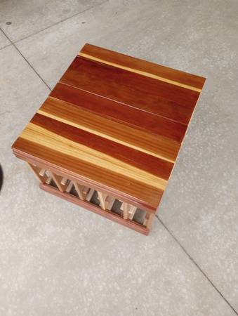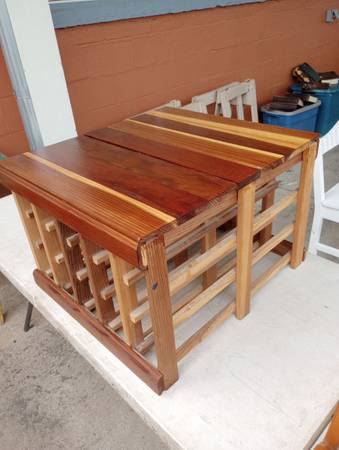Small table made to hold wine bottles in the bottom will hold 20 bottles has a new finish on it call or text to see 313407one4six8 James 7 mi Gratiot area
