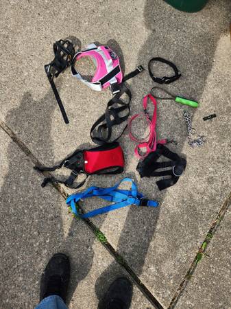 Dog stuff! Raised feeding bowl holder $5 Collars $2-5 Harnesses $3-5 Doggie clothes. Dog cage up to 60lbs $30 NEW PETPLE SUV Steel wire divider $30 Make offer....