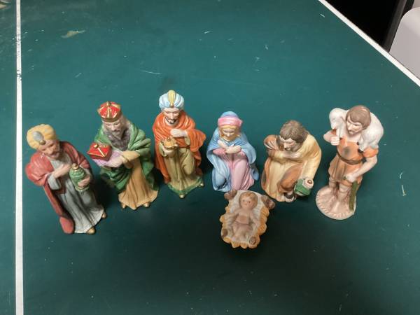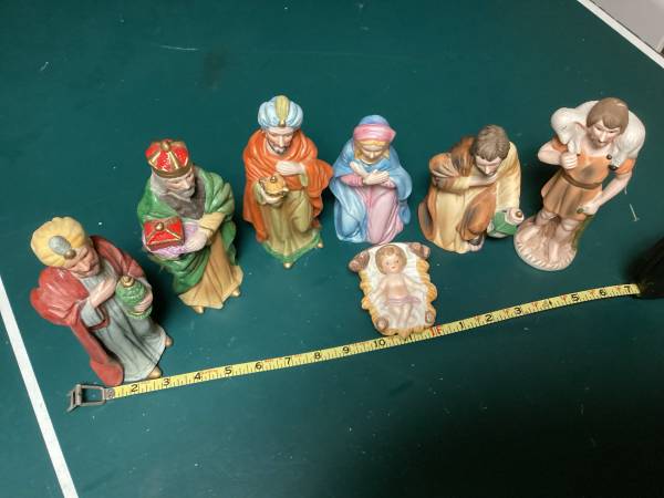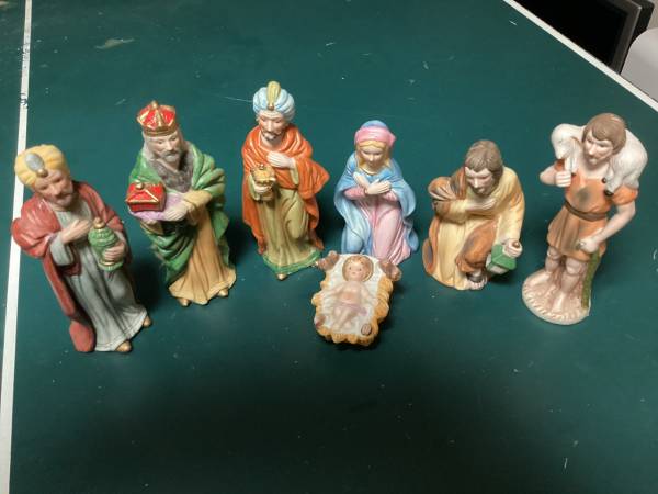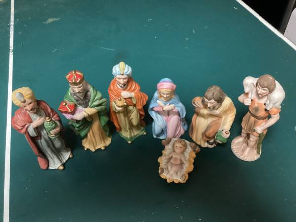 This is lovely seven piece Nativity or creche set with beautifully detailed figurines. This set would make a wonderful gift or addition to a Christmas display.