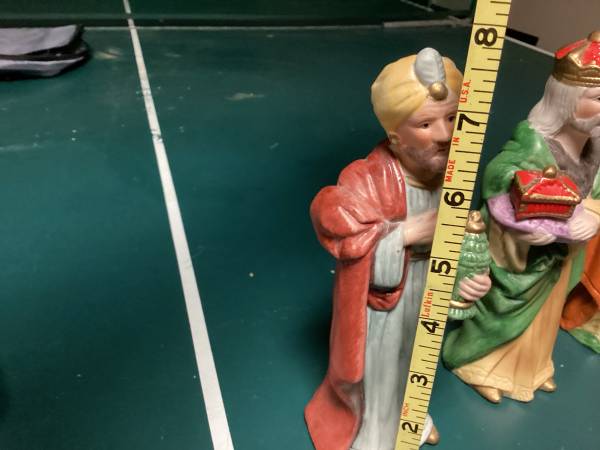 Vintage Nativity sets have become highly collectible. The set has seven strikingly detailed figurines with beautiful colors. This set is in good condition.